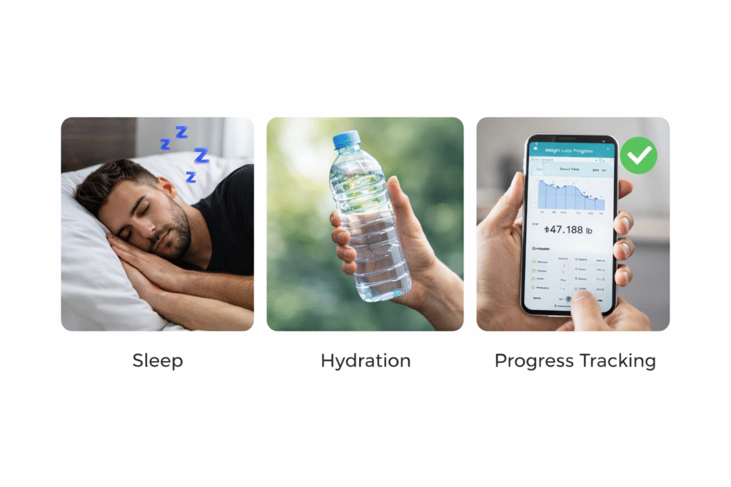 Aim for 7–8 hours of quality sleep daily. Drink at least 3 liters of water per day to support digestion and metabolism. Staying hydrated also reduces unnecessary hunger signals.